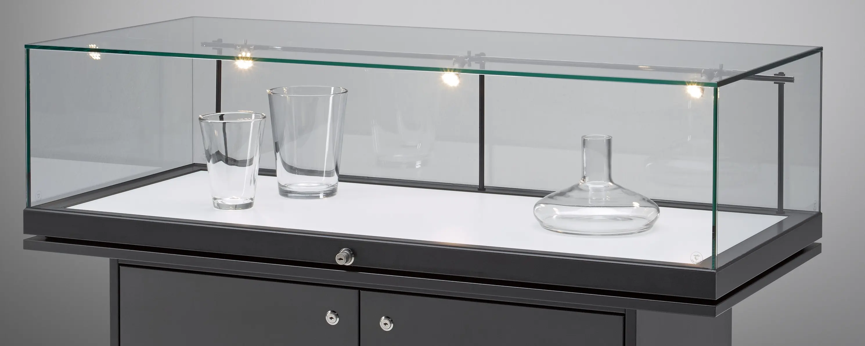 | Merkmale Vitrine: | Farbe schwarz, abschliessbar, aufklappbar, mit Beleuchtung, mit Glashaube, mit Sockel, mit Unterschrank, stehend |